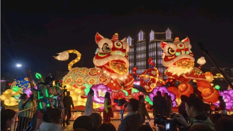 16组大型主题灯组沿河铺展,将千年秦文化与自贡彩灯匠心工艺相融,化作一道流光溢彩的“光影长廊”,点亮咸阳夜空。