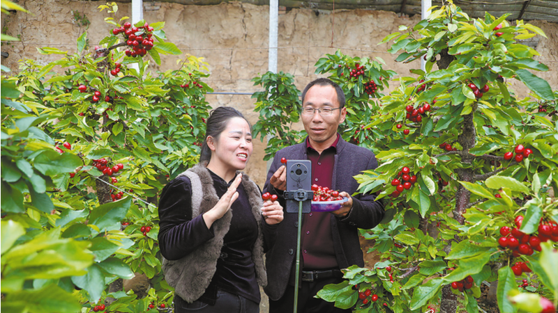3月2日,澄城县安里镇安里村的樱桃大棚里,一串串色泽鲜艳的“美早”樱桃挂满枝头,红得发亮、饱满多汁,李微微正对着手机镜头直播。