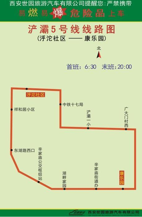 浐灞5号线由泘沱社区至广泰门地铁站之间的循环公交线路,全程5.8公里,途径广安路、北辰大道、浐灞二路、浐灞一路、广运潭大道,设康乐园(广泰门地铁站)、辛家庙街道办、湖畔家园、辛家庙公交枢纽站、东湖路西口、祥和居小区、泘沱社区、中铁十七局、浐灞一小、广大门村西站等10站。