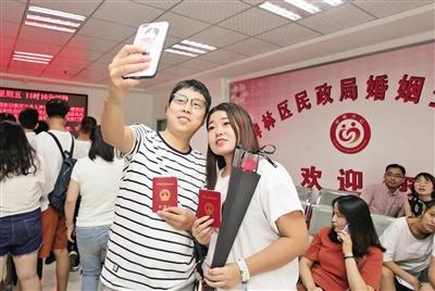 昨天到西安市碑林区民政局登记结婚的市民排起长队,图为一对情侣领到结婚证后拍照留念。 记者 王晓峰 摄