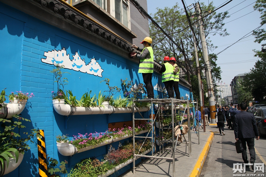 在新民二巷子附近的皇城西路,针对该街区绿化空间狭窄问题,新城区对皇城西路实施了多层次微型立体绿化,用PVC-U型排水管进行切割组合成立体花槽悬挂于沿街栏杆和墙面上,花槽内搭配种植了月季、鸢尾、红叶南天竹等10余种易成活、耐观赏的植物,让花草“长”在了栏杆上、“立”在了墙面上。
