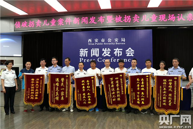 图为失散家庭亲属向西安市公安局赠送锦旗。