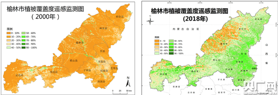 榆林市植被覆盖度遥感监测图2000年-2018年对比图 央广网发 见习记者叶里肯不拉 制图