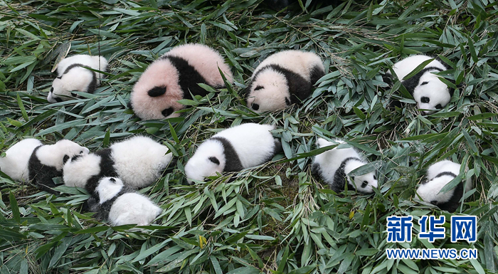 13日10时20分,记者在雅安碧峰峡基地白熊坪圈舍,看到17只大熊猫宝宝被饲养员排成3列,放在提前铺好的厚厚的竹叶上,时不时还能听到熊猫宝宝在奶声奶气地“吱吱”叫着。熊猫宝宝有的一动不动地趴在竹叶上,有的时不时探探脑袋,也有的不安分地爬来爬去,拱拱身旁的同伴。为充分保证完成配种的雌性大熊猫身体健康和正常受孕,从今年5月起,饲养人员便开始了24小时轮流值班制度,每一天,他们都在静候新生命的诞生。 这是10月13日在中国大熊猫保护研究中心雅安碧峰峡基地拍摄的2017年新出生的大熊猫宝宝。新华社记者 薛玉斌 摄 -