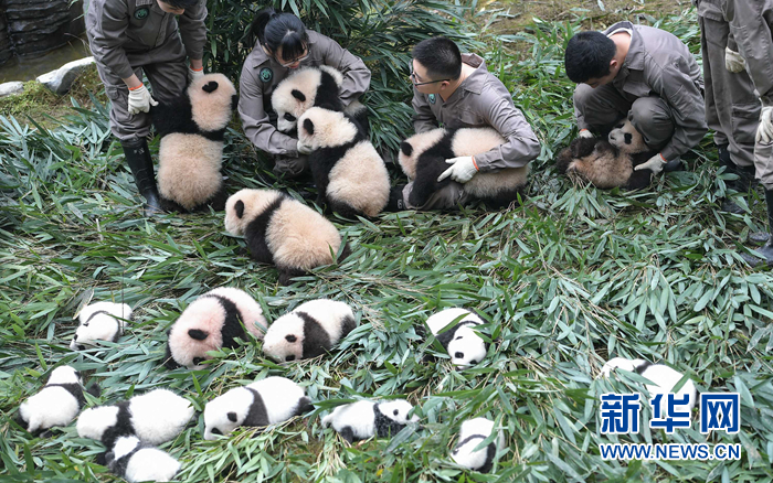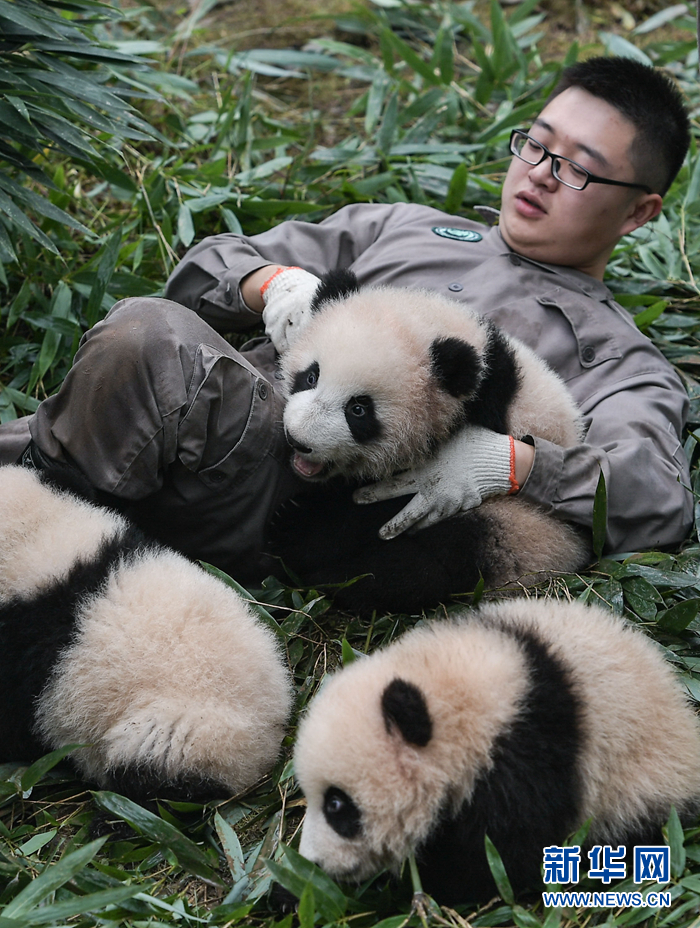 5月20日,大熊猫“茜茜”在雅安碧峰峡基地产下2017年全球首对双胞胎熊猫宝宝。5月31日,大熊猫“龙欣”在卧龙核桃坪基地产下一对双胞胎熊猫宝宝,为大熊猫野化培训提供个体。7月31日,野外引种大熊猫“草草”顺利产下一只雄性幼仔,圈养大熊猫野外引种试验取得阶段性成功。这是10月13日在中国大熊猫保护研究中心雅安碧峰峡基地拍摄的2017年新出生的大熊猫宝宝。新华社记者 薛玉斌 摄 -
