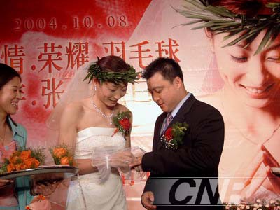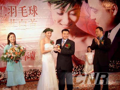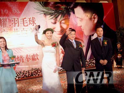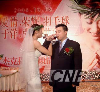 中广网大连10月8日消息(实习记者 王荣琦)10月8日上午11时,雅典奥运会羽毛球女单冠军张宁与爱人于洋举行隆重的结婚庆典,从这天起,张宁正式成为大连人的媳妇。