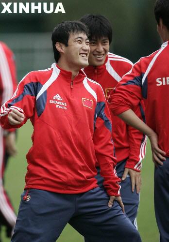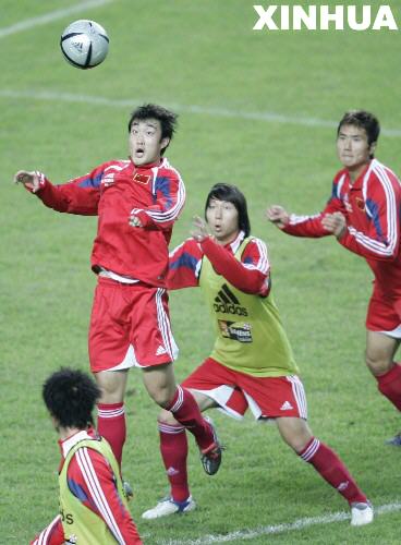 11月16日,中国队球员阎嵩(左一)在训练中。当日,中国队在广州越秀山体育场进行了2006世界杯预选赛中国队与中国香港队比赛前的最后一场训练。双方的比赛将于17日在广州进行。