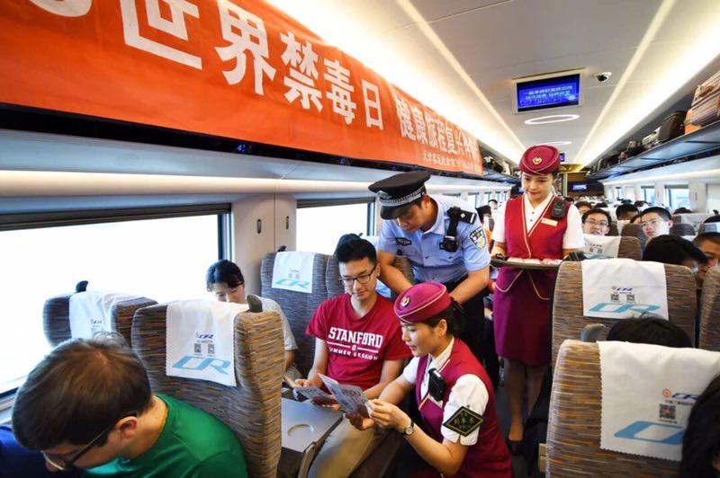 央广网天津6月27日消息(记者陈庆滨)6月26日是国际禁毒日。当日上午,天津乘警支队联合天津客运段登上北京南开往上海虹桥的G1次列车,开展“6.26国际禁毒日,健康旅程复兴伴您行”禁毒宣传活动。