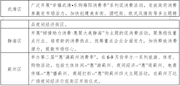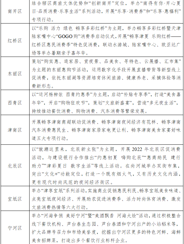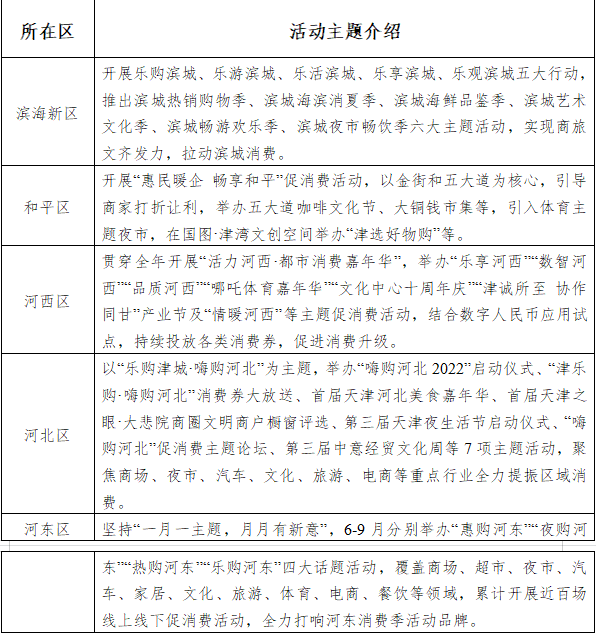 全市按照“一区一主题”“一业一方案”“津城”“滨城”互动的要求,立足各区资源禀赋,组织开展贯通线上线下、涵盖商品服务、面向城市乡村、融合商业旅游文化体育等多元化的购物节活动,打造津沽文化、海鲜河蟹文化、运河文化、老字号文化等主题促销,实现“天天有优惠,场场有特色,周周有精彩,月月有新意”。