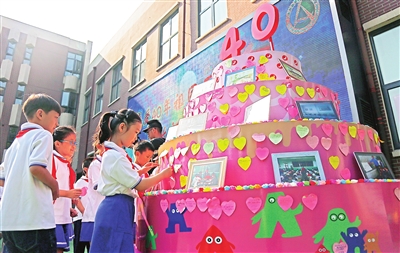 同一时间,昆明路小学请来消防和平支队的国旗班战士,为学生们举行庄严肃穆的升旗仪式,并邀请家长与孩子们分享自己对40年来社会变化的感受。在鞍山道小学的开学典礼上,孩子们亲手写下了对祖国、对家乡的真挚祝福,并把一张张心愿卡挂在了师生共同制作的巨大“生日蛋糕”上,最后,校长李庆东为大家送上新学期寄语:人人争当胸怀祖国、勇往直前、自强不息的新时代津彩少年,为实现中华民族伟大复兴的中国梦贡献自己的力量。