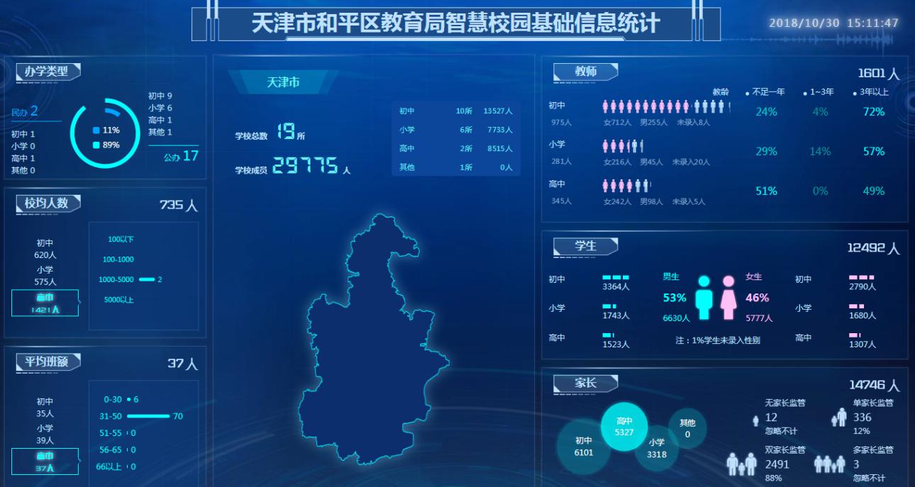 截至目前,“和平智慧校园”已经覆盖全区60%以上中小学,现有使用者已达29775人(其中学生12492人,教师1601人,家长14746人)。随着教育数据的不断累积将最终形成教师、学生的“人物画像”和学校的办学绩效动态评估,实现大数据驱动教育发展变革。