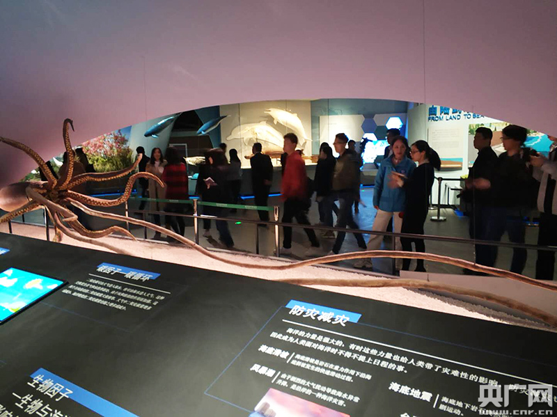 据介绍,试运行期间将开放的“远古海洋”、“今日海洋”、“发现之旅”和“龙的时代”四个展厅中,远古海洋展厅以地质年代为轴,通过展览叠层石、三叶虫、鹦鹉螺、菊石、鱼龙等1158件化石标本,讲述了46亿年以来地球、海洋和生命的演化故事。