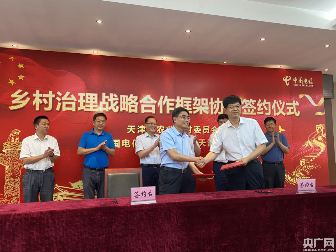 央广网天津7月22日消息(记者褚夫晴)7月21日,天津市农业农村委与中国电信天津分公司在天津市北辰区双街镇就深化乡村治理信息化工作签署战略合作框架协议。双方将通过战略合作,向试点示范单位提供“村村享”综合信息平台、“云网”资源和技术支撑,共同促进乡村治理信息化,为天津打造数字乡村提供战略支撑。