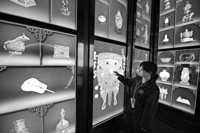 数字多宝阁上,90余件陶瓷、玻璃、金银器、玉器、青铜、雕漆等文物的高精度数字化模型亮出来了。交互方式还呈现出其制作工艺、纹饰特点、使用方式等。40余件文物还可以“拿”到三希堂里把玩,更可以直接放入手机带回家鉴赏。