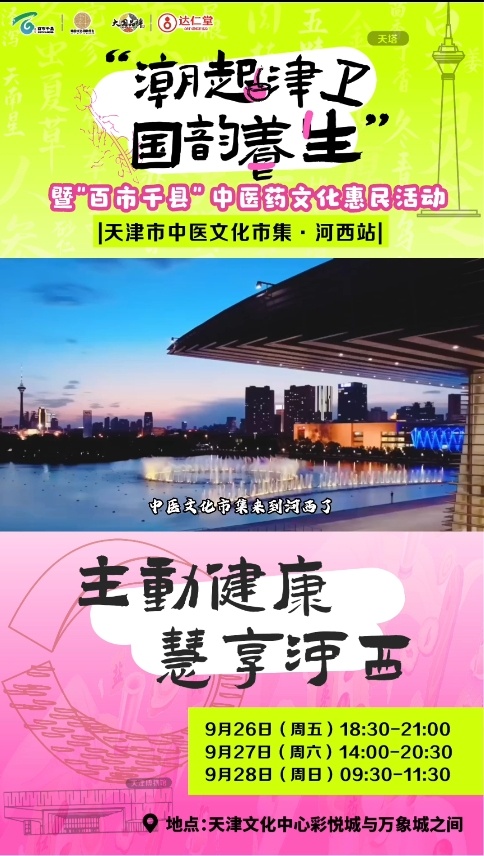 9月26日至28日,“潮起津卫 国韵养生”天津市中医文化市集河西站将隆重举行。