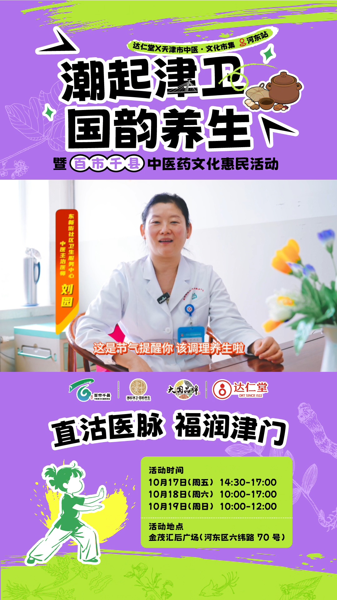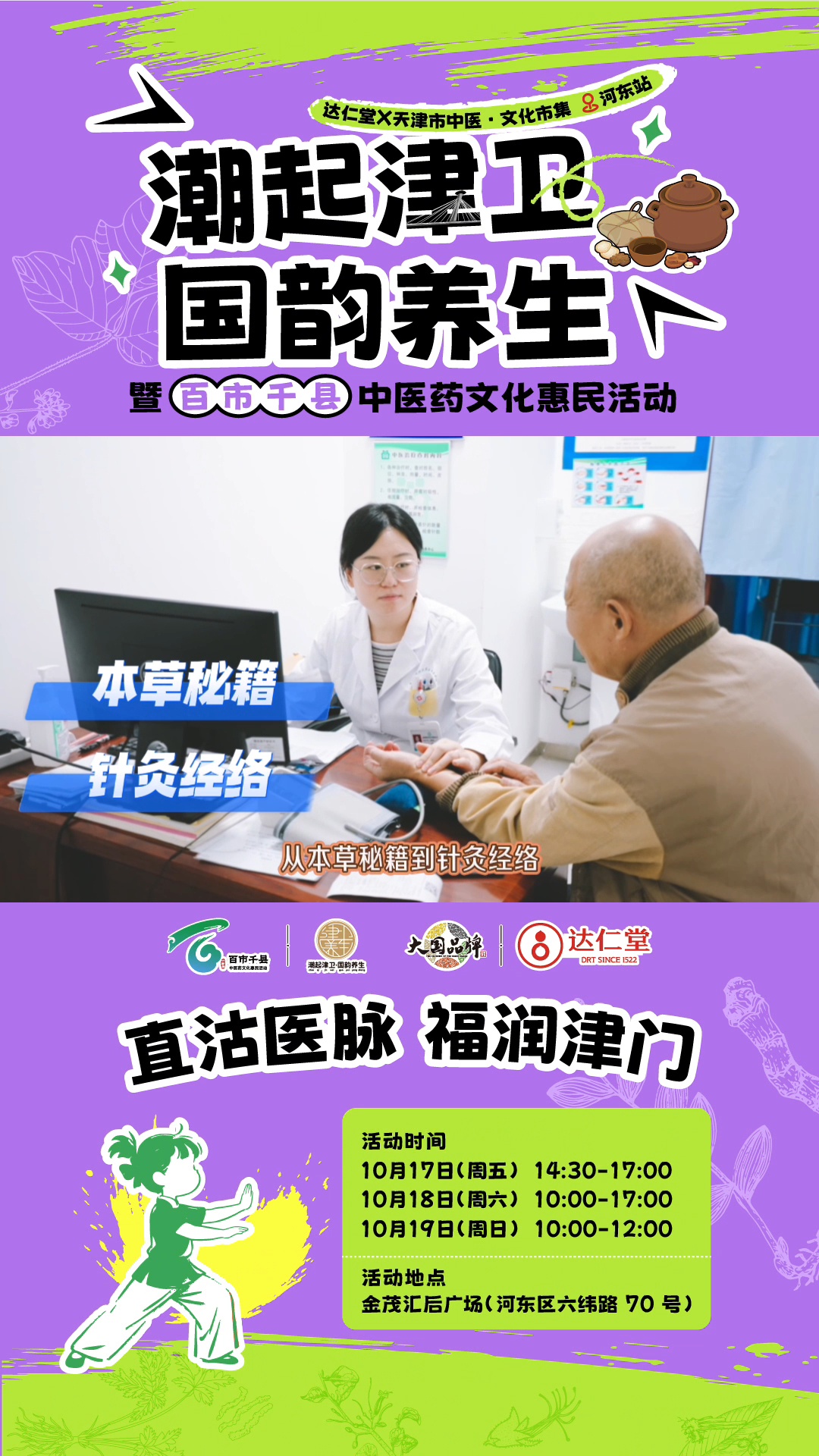 10月17日至19日,由津药达仁堂独家总冠名的“潮起津卫·国韵养生”天津市中医文化市集河东站将隆重举行。