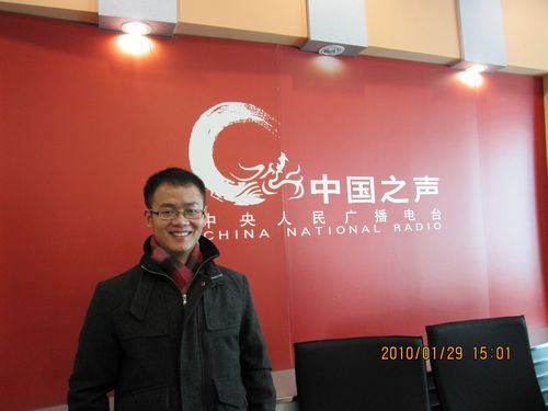 本文作者在中央人民广播电台第一套广播节目中国之声直播室留影