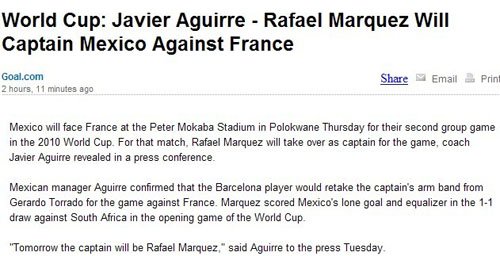 北京时间6月17日消息,墨西哥将在本周四迎战小组第二个对手法国队。赛前主教练阿吉雷在新闻发布会上透露,巴萨大将马科斯将取代托拉多成为这场比赛的场上队长。