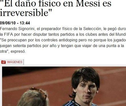 《号角报》在采访过阿根廷国家队体能教练西格诺里尼后,率先披露了这则消息。西格诺里尼表示,由于在此前一个赛季里,梅西参加比赛的次数过多,导致他身体目前处在异常疲惫的状态,这将影响他在世界杯上的发挥,“目前,梅西的身体损伤情况很严重,要知道,上赛季他在巴萨居然踢了近70场比赛,可以说这是常人所无法想象的,我认为他能坚持到今天这个还不算太糟糕的情况,完全是人类的奇迹。”