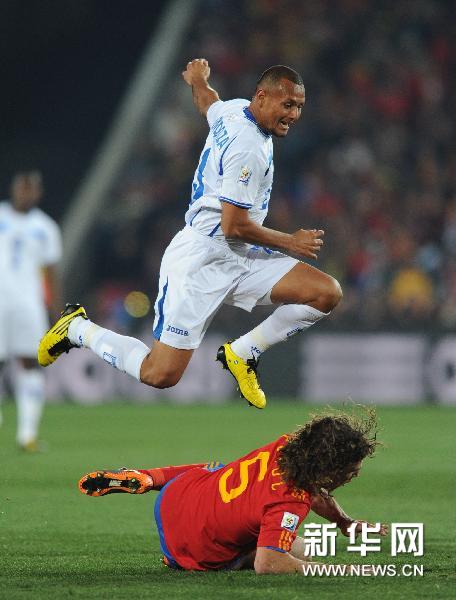 6月21日,洪都拉斯队球员门多萨(上)在比赛中进攻。当日,在约翰内斯堡埃利斯公园球场举行的2010南非世界杯足球赛H组比赛中,西班牙2比0战胜洪都拉斯。新华社记者郭勇摄