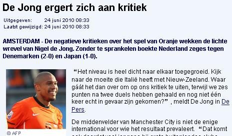 的确,荷兰在最近这几届世界杯的小组赛都不乏大比分击败对手的杰作,但结果常常令人怀疑,是不是状态出得太早让荷兰人后继无力?德容最后还提醒队友不要在乎16强对手是意大利还是巴拉圭,因为荷兰的目标只有冠军:“意大利或者巴拉圭都无所谓,一旦我们坚定目标,我们就不会关注其他事情。”