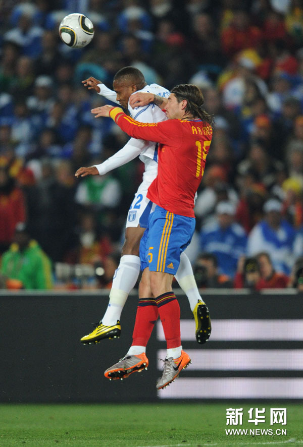 6月21日,西班牙队球员拉莫斯(右)在比赛中与对手争顶头球。当日,在约翰内斯堡埃利斯公园球场举行的2010南非世界杯足球赛H组比赛中,西班牙队对阵洪都拉斯队。新华社记者郭勇摄