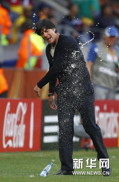 图为6月18日,在伊丽莎白港举行的2010南非世界杯D组德国队与塞尔维亚队的比赛中,德国队主帅勒夫在比赛中摔掉矿泉水瓶。 新华社/路透