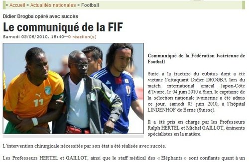 据科特迪瓦足协称,德罗巴的手术非常成功,但能否快速复出赶上比赛还有待于进一步另外观察。不过据德罗巴的主治医师赫特尔讲,他对德罗巴的恢复能力感到自信,并相信魔兽可以火速复出。