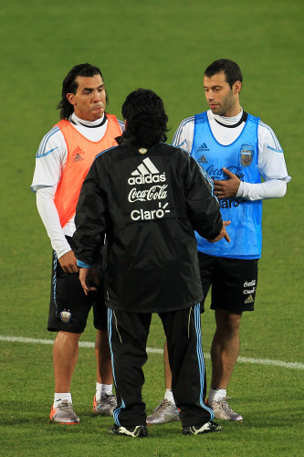 北京时间6月9日消息,阿根廷队在南非比勒陀利亚训练备战世界杯。图为阿根廷队主帅马拉多纳与队员特维斯、马斯切拉诺交流。
