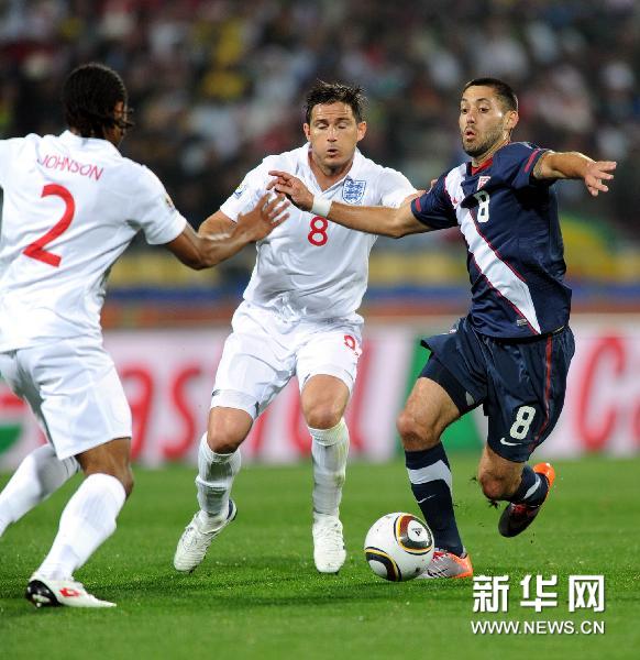 6月12日,英格兰队球员兰帕德(中)与美国队球员邓普希拼抢。当日,在勒斯滕堡举行的2010年南非世界杯C组比赛中,英格兰队以1比1战平美国队。新华社记者郭勇摄