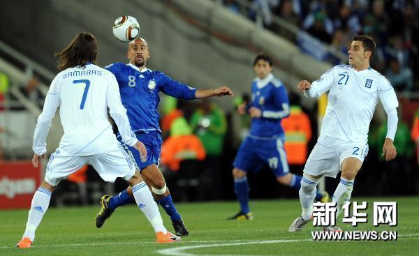 6月22日,希腊队球员吉·萨马拉斯(左)与阿根廷队球员胡安·贝隆(左二)争抢。当日,在南非波罗瓜尼举行的世界杯足球赛B组第三轮比赛中,希腊对阵阿根廷。新华社记者王毓国摄
