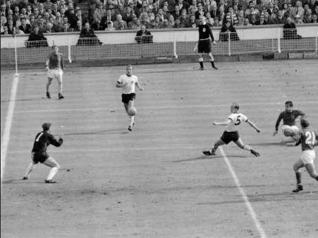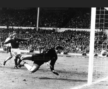 德国队禁区内风声鹤唳,赫斯特将球送入门将汉斯-蒂尔科夫斯基把守的大门。