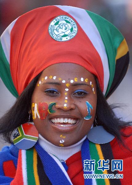 图为6月16日,一名南非队女球迷精心装扮后,准备为球队加油助威。当日,在茨瓦内举行的2010年南非世界杯A组比赛中,南非队对阵乌拉圭队。新华社发
