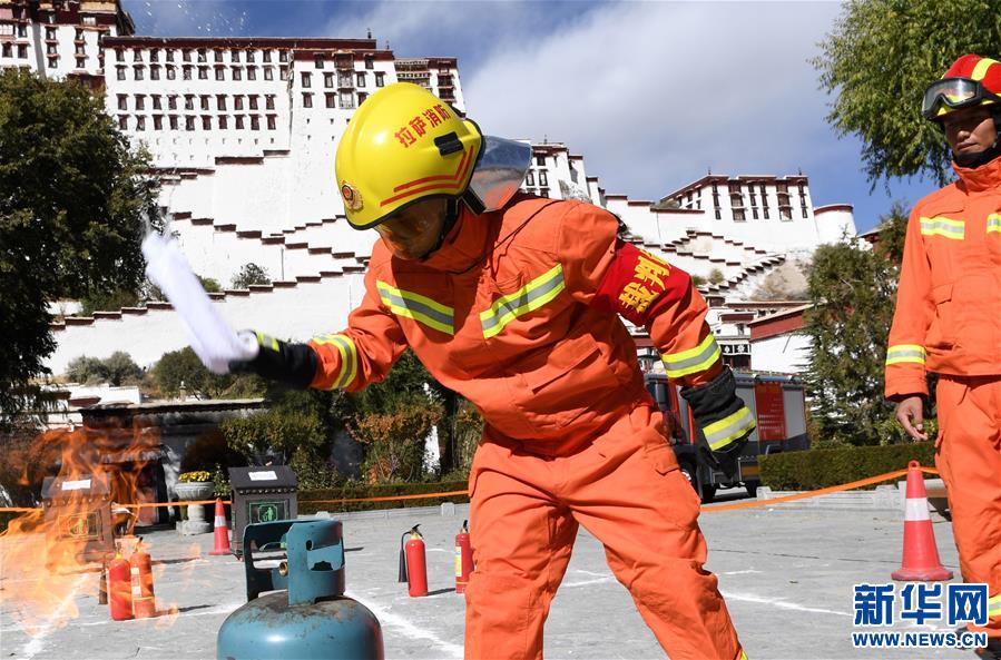 11月9日,消防战士演示灭火。 新华社记者 觉果 摄 11月9日,西藏拉萨布达拉宫管理处在布达拉宫消防大队的配合下,举办了一场消防宣传活动。