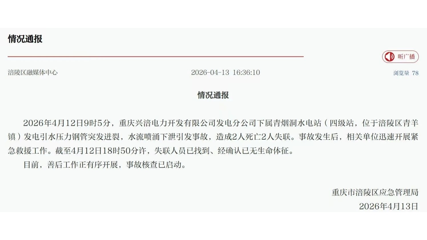 4月12日9时5分,重庆兴涪电力开发有限公司发电分公司下属青烟洞水电站发电引水压力钢管突发迸裂,水流喷涌下泄引发事故,造成4人死亡。