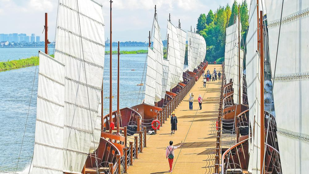 近日,昆明滇池绿道环草海段钢浮桥重新向公众开放。