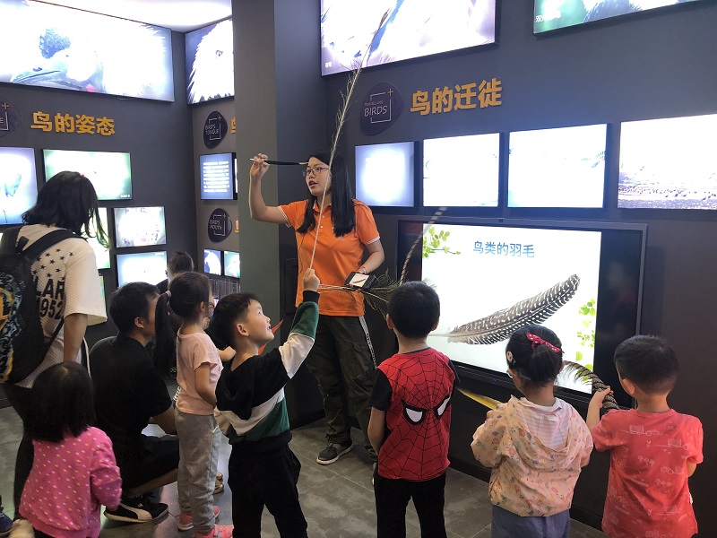 在乐园各个区域都设置了科普内容,与目前国内能见到的主要方式大不相同。在动物食堂外,有很多动物的图片,图片后面藏着一个“密道”,游客拉开后将显示动物喜爱的食物配方,小朋友可以根据配方为动物搭配营养食物;在乐园里,还有专门的拼图墙,有动物的局部身体构造组件,游客可以根据自己的理解,拼出完整的动物图形,了解动物的骨骼构造;在鸟类科普区,游客可以近距离观察多彩鸟羽;最为特别的是,乐园是云南首家将本土生态进行呈现的动物主题公园。乐园专门设置了滇池水域模拟区,通过一个微缩的版本,帮助游客全面了解滇池的生态系统特性。乐园的科普内容非常丰富,囊括生态系统、食物链、动植物方方面面的知识,全部通过趣味的探索和操作,自然而然了解动物知识。