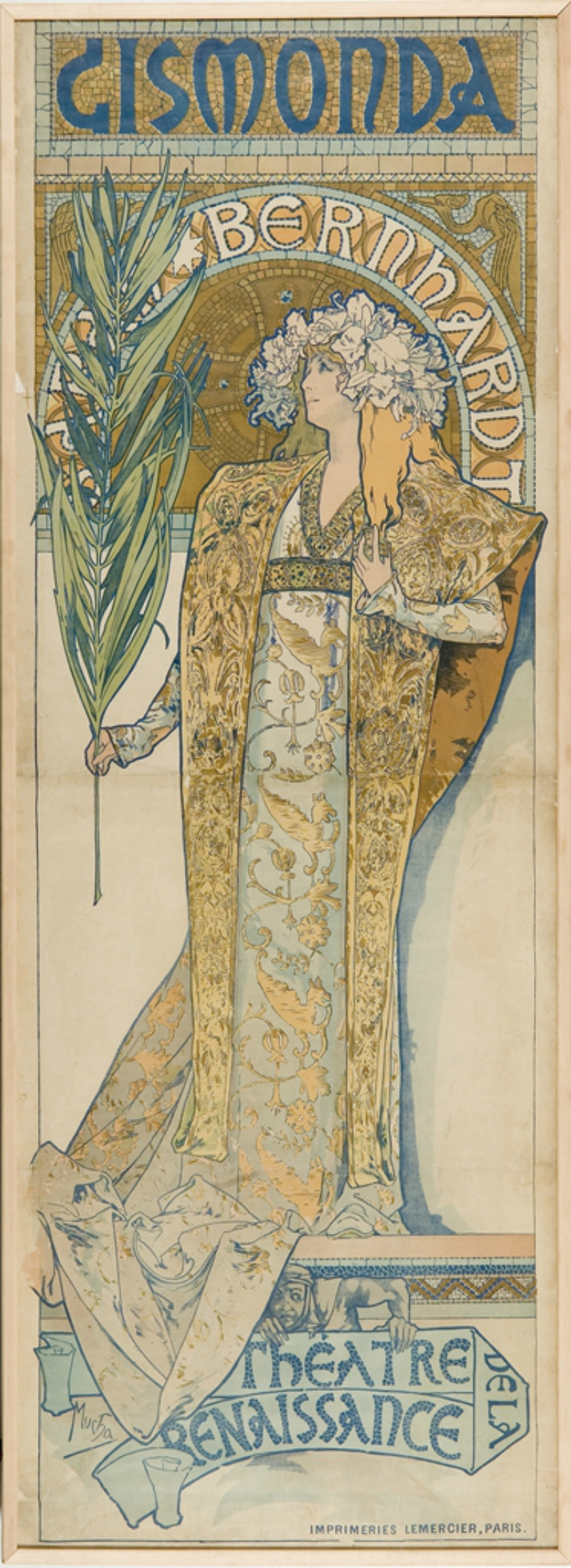 (1894年,穆夏为著名的法国演员莎拉·伯恩哈特在文艺复兴剧院上演的雨果·萨尔多的歌舞剧《吉斯蒙达》的剧中角色创作了他代表性的传奇海报)