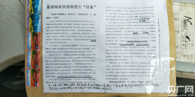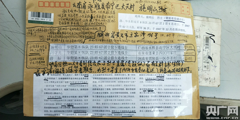 这两天,一封地址错乱的信件被寄到了云南省永胜县,收件人正是136名烈士之一的施明山。由于当年登记的信息与现在的行政区划对不上,施明山烈士的故乡早已无从考证。一时间,“请广大朋友转发,助烈士找到家属亲人”的朋友圈消息被云南省永胜县的投递员们不断转发。与此同时,全国多地已经行动起来、接力寻亲。