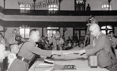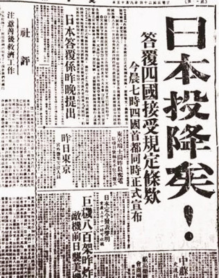 1945年8月15日,日本天皇裕仁广播《停战诏书》,宣布接受《彼茨坦公告》所规定的各项条件,无条件投降。15日晨7时,中、苏、美、英4国在各自首都同时宣布日本投降。美联社在这一天向全球发出的电文是:“最惨烈的死亡与毁灭的汇集,今天随着日本投降而告终。”