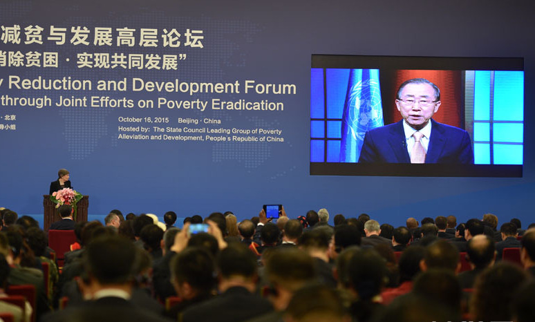 10月16日,2015减贫与发展高层论坛在人民大会堂金色大厅举行。现场播放联合国秘书长潘基文视频致辞。
