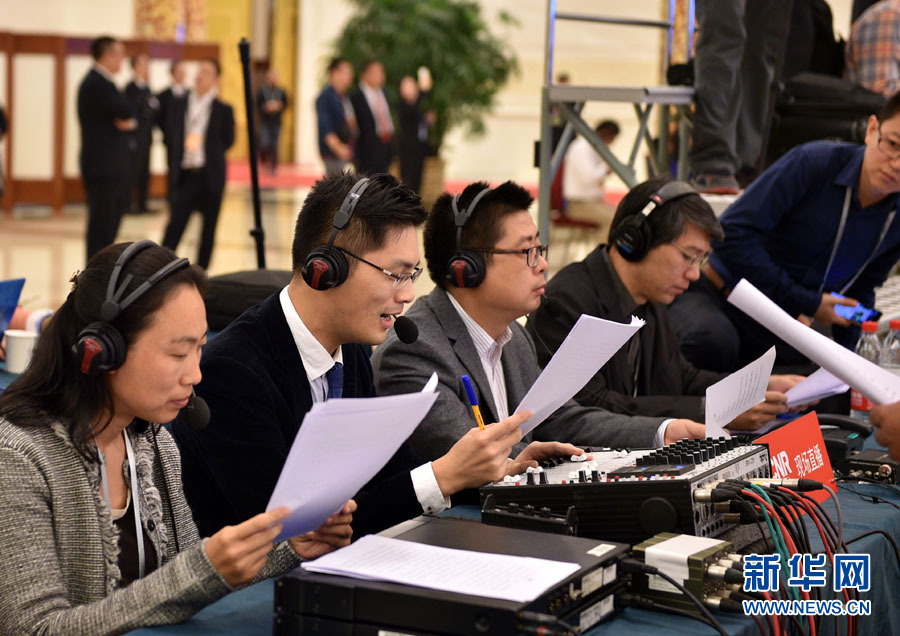 10月16日,2015减贫与发展高层论坛在人民大会堂金色大厅举行。图为媒体记者正在进行紧张工作。新华网记者 郭小天 摄