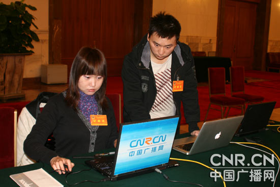 今天(26日)上午,全国公安机关爱民模范先进事迹报告会在人民大会堂举行。会上,100个爱民集体、200名爱民模范受到表彰。中国广播网进行现场图、文直播。图为中国广播工作人员在直播现场。(中广网记者陈钟 摄)