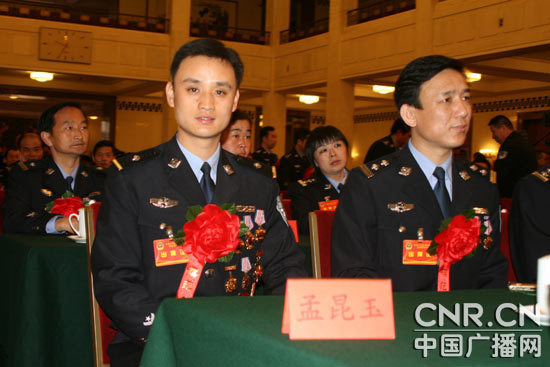 今天(26日)上午,全国公安机关爱民模范先进事迹报告会在人民大会堂举行。会上,100个爱民集体、200名爱民模范受到表彰。中国广播网进行现场图、文直播。图为北京市公安局公安交通管理局宣武支队广安门大队民警孟昆玉。(中广网记者陈钟 摄)