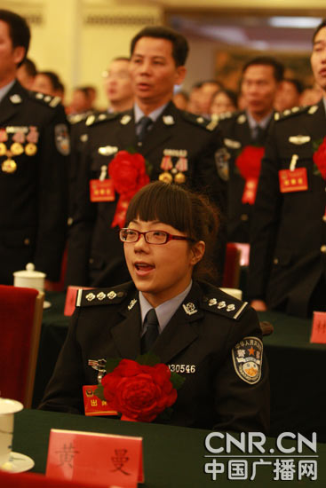 今天(26日)上午,全国公安机关爱民模范先进事迹报告会在人民大会堂举行。会上,100个爱民集体、200名爱民模范受到表彰。中国广播网进行现场图、文直播。图为四川省绵阳市公安局涪城分局因公致残警花黄曼坐在轮椅上高唱国歌。(中广网记者陈钟 摄)