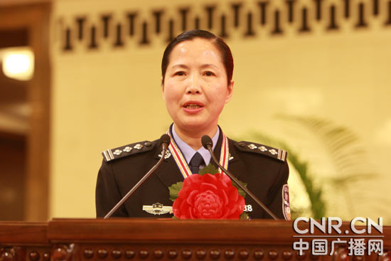 今天(26日)上午,全国公安机关爱民模范先进事迹报告会在人民大会堂举行。会上,100个爱民集体、200名爱民模范受到表彰。中国广播网进行现场图、文直播。图为安徽省公安厅刑警总队大案科副科长唐庆美在作报告。(中广网记者陈钟 摄)