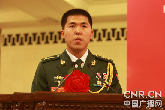 今天(26日)上午,全国公安机关爱民模范先进事迹报告会在人民大会堂举行。会上,100个爱民集体、200名爱民模范受到表彰。中国广播网进行现场图、文直播。图为新疆公安边防总队克州支队哈拉峻边防派出所民警王吉祥在做报告。(中广网记者陈钟 摄)
