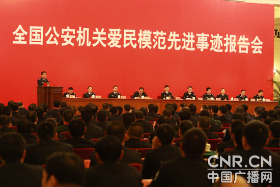 今天(26日)上午,全国公安机关爱民模范先进事迹报告会在人民大会堂举行。会上,100个爱民集体、200名爱民模范受到表彰。中国广播网进行现场图、文直播。图为报告会现场。(中广网记者陈钟 摄)