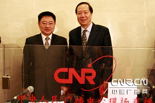 中宣部新闻局副局长刘汉俊(左)看望中央台直播人员
