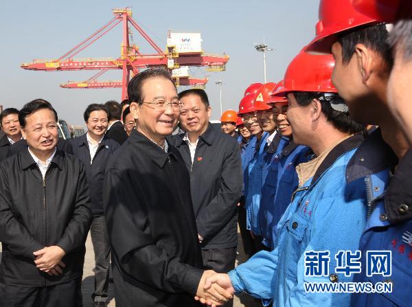 10月22日至23日,中共中央政治局常委、国务院总理温家宝在武汉就当前经济运行情况进行调研。这是10月22日,温家宝在正在建设中的武汉新港阳逻港区亲切看望码头工人和正在卸集装箱的“中远3号”船员。新华社记者姚大伟摄